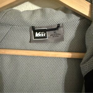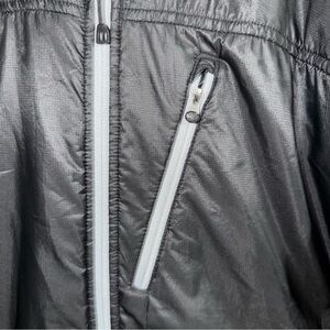 EUC REI Polartec Alpha Insulated rain jacket in black with gray accents. Full zipper hooded jacket. Three zippers on front of jacket.