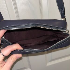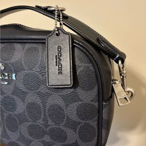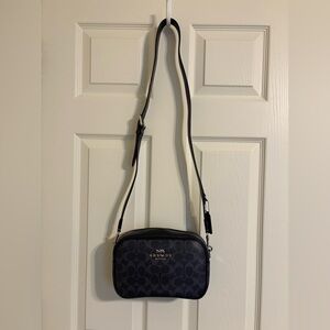 Stylish Coach crossbody Jamie Camera bag in signature canvas Silver/Denim/Midnight Navy. Features signature logo pattern and adjustable strap. Zipper closure with inside pocket. Inner fabric is a brown color. Only used once. Great condition from a smoke free home.