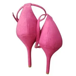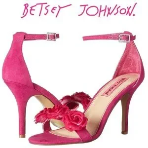 BETSEY JOHNSON Bromme Fuchsia Pink Fabric Floral Roses Ankle Strap Dress Sandal Faux Suede Open Toe 3.5” Heels Stilettos 👠 Evening Shoes