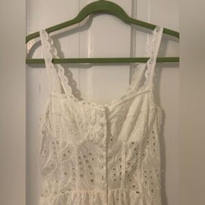 Design: Broderie anglaise, scalloped straps, fitted bodice, and a flared, tiered hem.