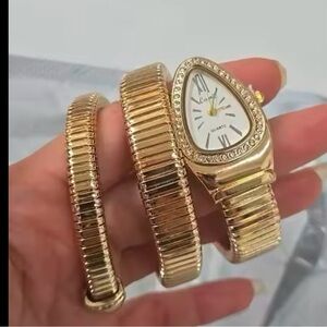 This exquisite timepiece exudes timeless luxury and sophistication, crafted for those with an eye for elegance. The watch boasts a radiant gold-tone finish, seamlessly intertwined in a serpentine coil bracelet that gracefully wraps around the wrist, embodying both opulence and comfort.