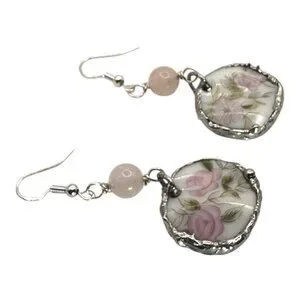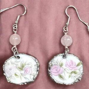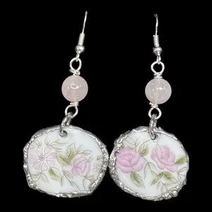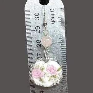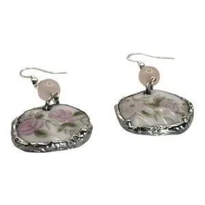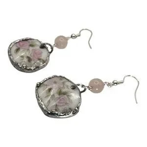 Elegant earrings crafted from repurposed broken china, featuring delicate floral patterns. Accented with a silver blend bezel and rose quartz, these earrings offer a timeless, unique look suitable for any occasion.
