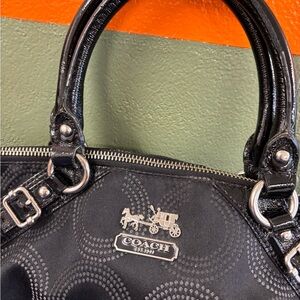 Coach handbag in good used condition. This black purse is in good condition on the outside. It has a large stain on the lining as photoed. This is item G1093-15935. If you would like any additional photos, please let me know prior to purchase.