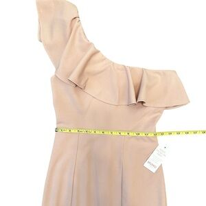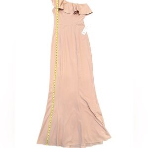 Show Me Your Mumu Florentine Maxi Dress in XS is a soft, blush pink gown featuring a feminine one-shoulder design. The standout detail is its ruffled neckline, which gracefully drapes across the chest and over one shoulder for an elegant touch. The fitted bodice transitions smoothly into a long, flowing maxi skirt that creates a sleek silhouette. Refined and sophisticated look, ideal for formal events, weddings, or special occasions. Fully lined.