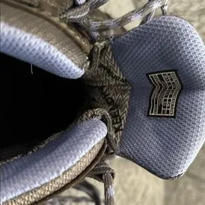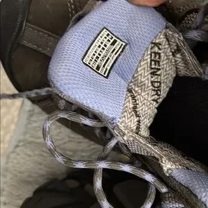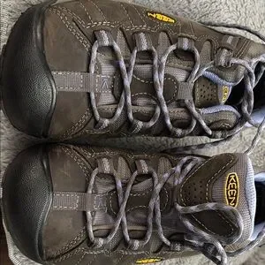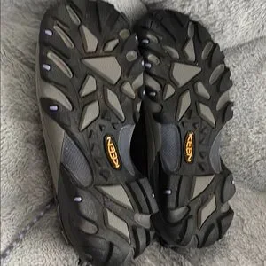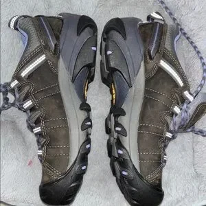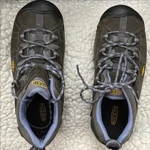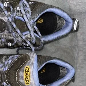 Keen hiking shoes in gray with blue and gray accents. Durable and stylish for outdoor adventures. Excellent condition.