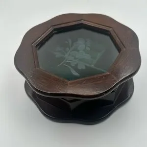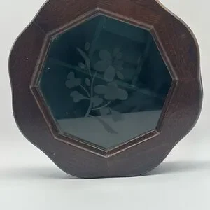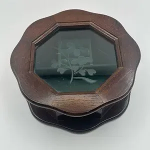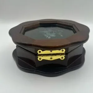 Elegant wooden jewelry box with an octagonal shape. Features a glass top with floral design. Perfect for storing small treasures.