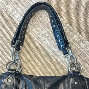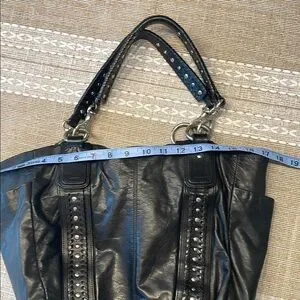 Elevate your style with this chic Sigrid Olsen black studded leather tote bag. Perfect for any occasion, this bag combines elegance with functionality. The sleek design and durable material make it a must-have accessory. The interior is clean, and fully lined, with pockets.
