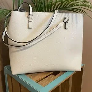 Elevate your style with the Nanette Lepore White Leather Tote Bag. This elegant bag features a sleek design perfect for any occasion. Crafted with high-quality materials, it offers both durability and sophistication. The white color adds a touch of class to your ensemble. One tiny little call out on front left corner. See last picture.