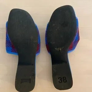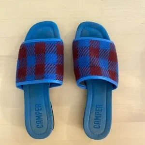 Stylish and comfortable, these Camper slides feature a vibrant blue and red plaid design. Perfect for everyday wear.