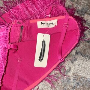 Stand out with this vibrant pink feathered crop top. Perfect for a bold fashion statement.