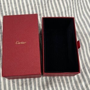 Elegant red jewelry box with Cartier logo. Perfect for storing precious items. Measurements 3x5”