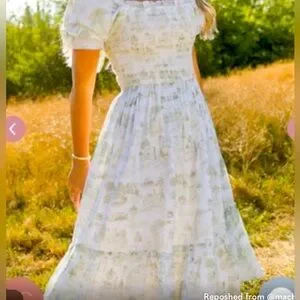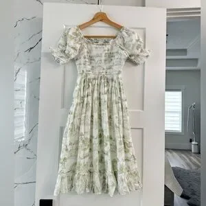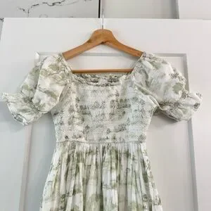Perfect spring dress that has lots of room with smocking. It can be perfect for spring pictures, it has lots of stretch up top so it adjust to your body. I wore this pre-pregnancy and during and it’s been wonderful both ways! Gently used. Hard to find 100% cotton and it is sold out. It is a midi length. I can ship the same day if ordered before 1pm pacific standard time.