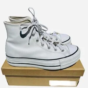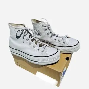 Classic white Converse high-top sneakers. Iconic design with lace-up closure. Durable rubber sole.
