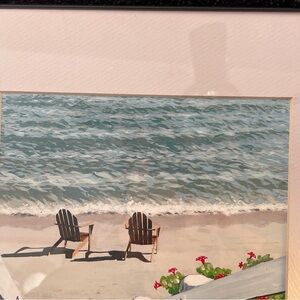 This is a signed framed painting titled "Beach for Two," depicting a serene beach scene. The painting features two Adirondack chairs on a sandy beach facing the ocean, with gentle waves lapping the shore. A wooden walkway with white railings leads down to the beach, adorned with red and green flowering plants on one side. The artwork captures a tranquil and inviting coastal setting, evoking a sense of relaxation and companionship. The signature is visible in the bottom right corner, indicating the artist.