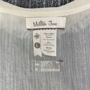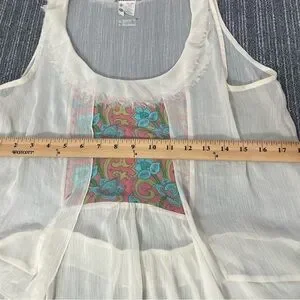 Matilda Jane Elegant sheer white sleeveless tunic featuring a vibrant multicolor pattern on the front. Perfect for layering.