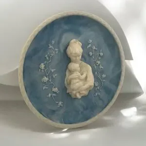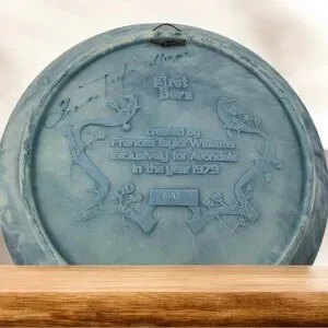 This collector plate by Avondale features a beautiful blue cameo of a mother and child, titled "First Born" and signed by artist Frances Taylor Williams. This beautiful piece is an authentic Inoclay which means ‘in colored layers.’ Colored crushed stone is molded into a shape with a cameo stone on top. The blue marbled background showcases the high relief details of the mother, child, floral accents and decorative border. The theme of this sculpture centers around the precious relationship between mother and child. This is a vintage plate made in 1979 and part of a limited edition series, numbered 6142 and measures 10.25” diameter. Although creased with a torn area, the original colored label that gives info about the artist will be included. The plate is in excellent, preowned condition with no chips, breakage or damage. Please review all photos as they are part of the description. This is the perfect gift for Mother's Day, birthday, new baby, baby shower or for anyone who collects unique and decorative plates.