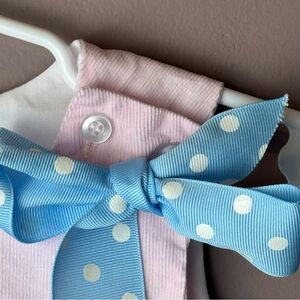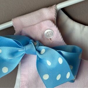 Pink corduroy with white princess kitty cat wearing a tiara. Has blue and white polka dot ribbons that tie at shoulder.