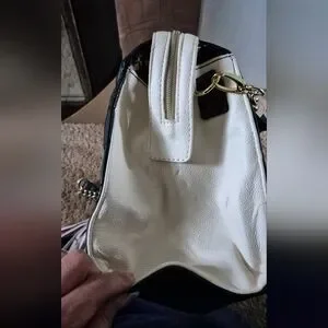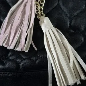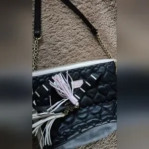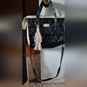 S Betsey Johnson black and white handbag with embossed hearts includes pink and white tassels.Stylish In lightly pre-owned condition 12" W x 10" H x 6" D