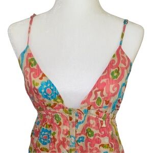 Sleeveless, plunge, maxi silhouette, paisley print, pink, boho, high low, tie back, adjustable strap