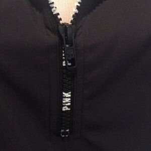 This jacket is amazing. Marked XS but also easily fits a small. Comes down to your hips. Soft, comfortable polyester with half zip front and zippers on bottom part with vents for whenever you are working out. Brand new. Great windbreaker.