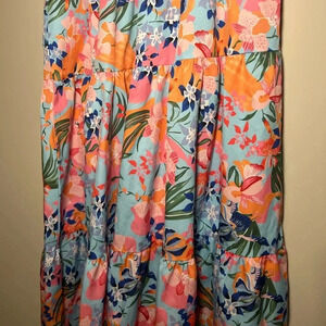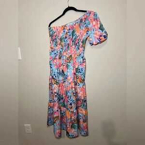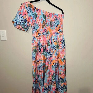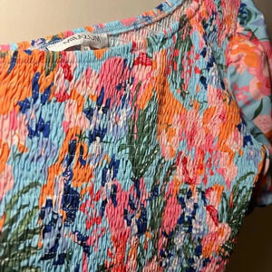 Only worn once to summer wedding- great!!! No visible flaws excellent condition! Not lined. Smocked top- one shoulder
