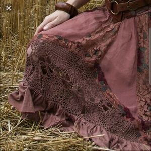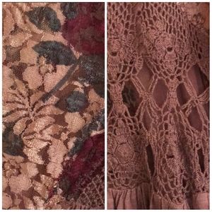 Free People New Romantics Floral Godet skirt, sz L. High low skirt in a dusty rose w/ pops of burgundy, dark brown & teal. Constructed of semi sheer panels alternating with floral patterned contrast lace godets. Skirt features a crochet inset in front and a wide elastic waistband for an adjustable fit. Measures approx 14.5" flat unstretched waist and about 27"-37" variable hem length. Skirt is unlined. Fabrication: 80% rayon, 12% cotton, 8% nylon. Very rare item in excellent preowned condition.