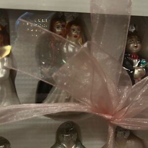 Celebrate a bridal shower, wedding or your first year as a married couple with this elegant holiday ornament set, Featuring 12 Ornaments including bouquet, get away car, bride, a wedding bell, the married couple, lovebirds, love and wedding presents, the groom, a cake, a champagne bottle, a home and a heart.Perfect for adding a touch of charm to your home decor.or even use as Table Decor.