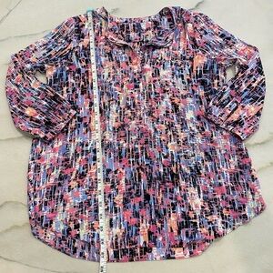 NYDJ Blouse in size Small. Henley style with button up top. 3/4 length sleeves. Bright multicolor print on lightweight flowy fabric. Please see photos for measurements. Perfect condition, no flaws present.