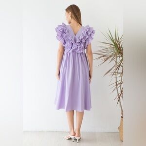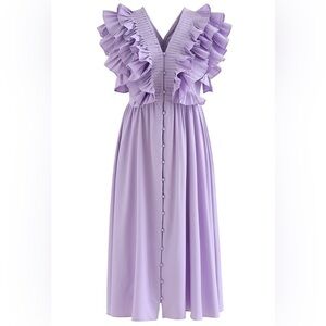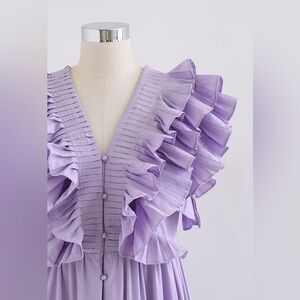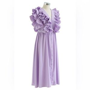 PLEATED RUFFLE BUTTONED DEEP V-NECK DRESS IN LILAC
