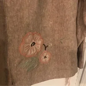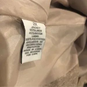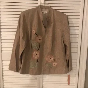 Fully lined linen/rayon blend blazer from Dress Barn. Khaki linen blend with floral detail in shades of coral, green, and brown. Zip front closure with mandarin collar. Blazer is 55% linen 45% rayon; lining is 100% polyester. NWT. Smoke and pet free home. Plus size 2X.