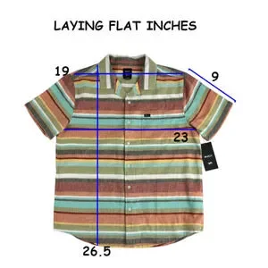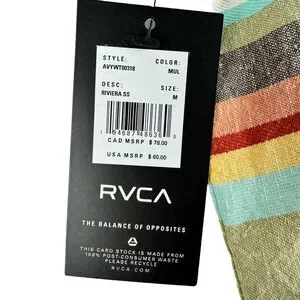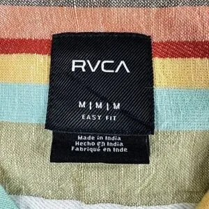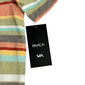 This RVCA Riviera boys' button-up shirt is a stylish addition to any young gentleman's wardrobe. With a size of M, it features a colorful striped pattern that adds a touch of vibrancy to any outfit. The collared neckline and button closure make it perfect for casual and travel occasions, and the short sleeves are ideal for warm summer, fall, and spring weather. Crafted in India from woven cotton fabric, this regular-fit shirt boasts a convenient pocket and RVCA logo accents. It's easy to care for with machine-washable garment care instructions. This shirt is perfect for school or any other activity and will surely become a favorite in any boy's collection.