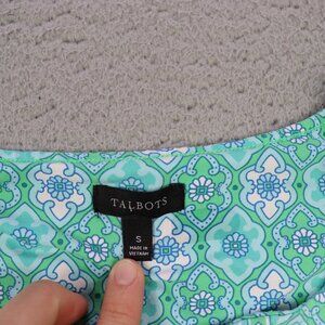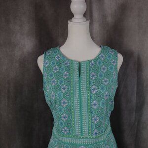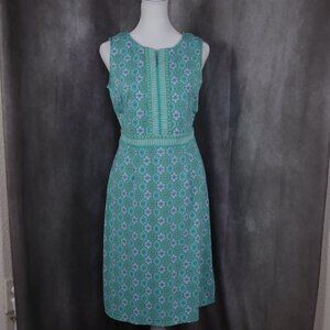 Talbots Shift Dress Womens Small Green Blue Floral Geometric Split Neck Preppy