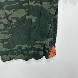 Affliction tee with a bold graphic design. Features camouflage pattern with orange and cream accents.
