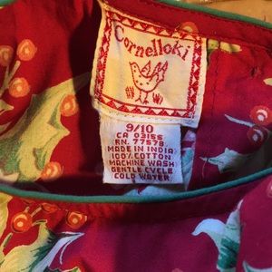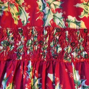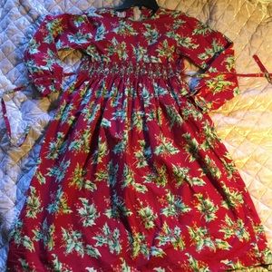 Vintage April Cornell Cornelloki Holly print party, folk, retro,smocked, prairie dress This is a holiday classic worn my a couple of my daughters on holidays . Timeless Vintage button down back , cinched waist,long sleeve cotton twill dress . Measures laid flat 14.5” waist , Length 47 inch from neck to hem and pit to pit 16”. Thanks for looking . The purple one is to show full dress it was hard to get a full shot of mine so the one for sale is red no pilling or wear like new condition no tears or wear only worn for 1 party without incident.