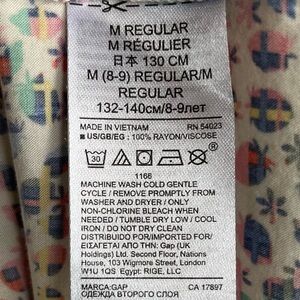 This is a super cute circle skirt from GAP Kids, girl’s size Medium (8). The lightweight woven fabric, 100% rayon, is a pattern of silhouettes of strawberries and flowers in a wide array of colors:red, pink, green, dark blue, yellow, and light blue on an eggshell white background. Features an elastic waistband for pull on ease. Pair this twirly skirt with any color, and your young one will happily get on with her day!