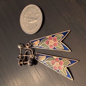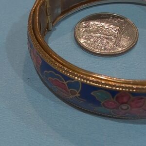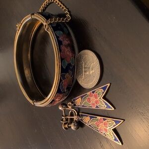 vintage cloisonne elegant floral enamel bracelet and earrings featuring vibrant blue and pink hues with gold accents. Perfect for adding a touch of color to any outfit.