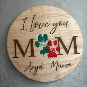 Wooden I Love You Mom Wall Decor, can personalize with names below. You put hand or paw prints on. Keyhole hanger on back so your walls don’t get scratched.