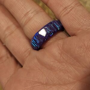 Don't want a typical wedding band? Look no further. This purple opal ring is perfect for either a wedding band or just to wear because it's beautiful. Stronger than gold and pretty scuff proof. Very light and comfortable ring in a size 6. Please feel free to ask any questions.