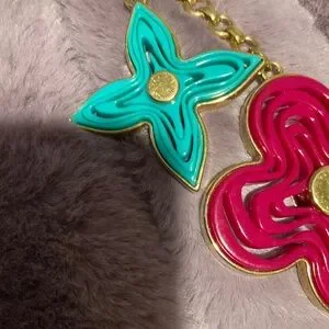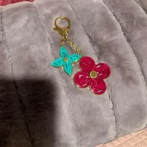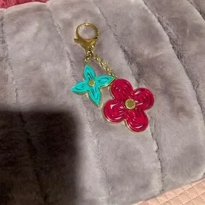 Preowned Louis Vuitton teal and fushia bag charm with gold hardware. Good condition with minor wear/scratches on hardware. Reposhing and never used.