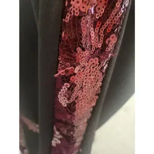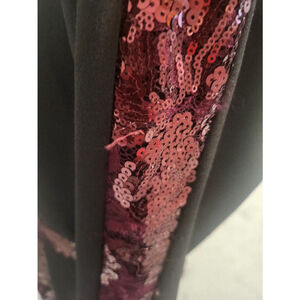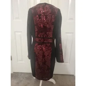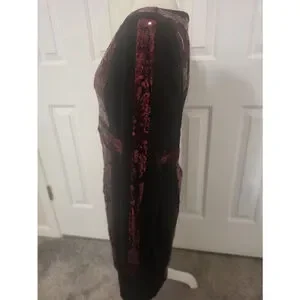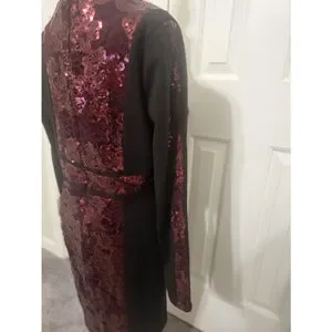 This is a pre-owned Guess Los Angeles long-sleeved dress in size 16. It is a black dress with a burgundy sequined panel down the front, back and sleeves. The dress has a V-neckline and a fitted silhouette. The fabric is a blend of polyester and spandex. The dress has a back zipper closure. The dress is in good condition with no visible tears or stains. There is a small loose thread on the sequined panel, but overall, good condition!