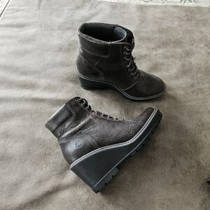 Timberland Kellis Lace Up Wedge Boots. Women's size 7. Preowned in good condition. Grey, brown, Taupe color.