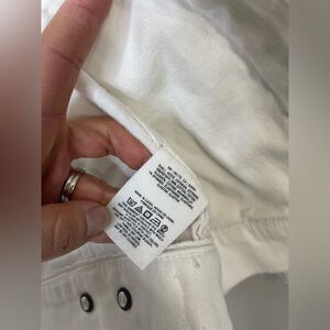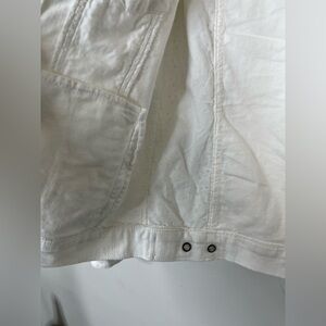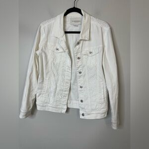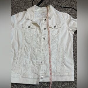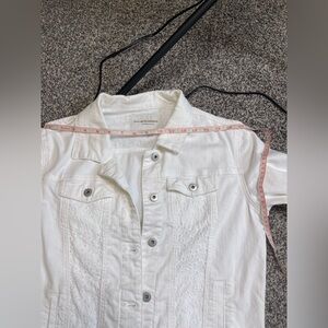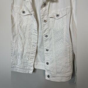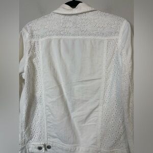 Anthropologie white Stretch Denim Eyelet Lace Trim Denim Jacket XS Fits Large
