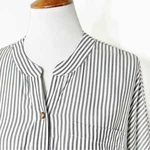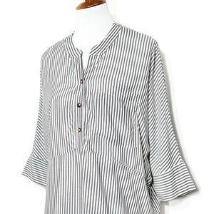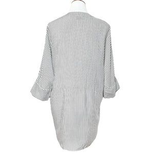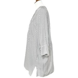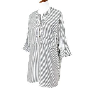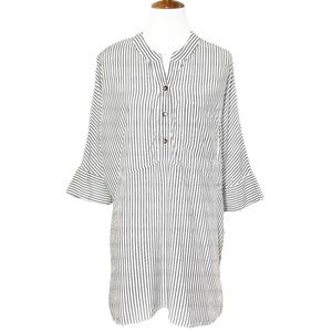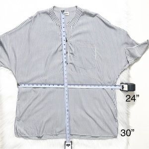 Show Me Your Mumu black and white striped oversized tunic. Split V button neck, elbow length dolman sleeves, chest patch pocket, straight hem with side hem vents. Draped oversize fit, longer length. White with light black stripes, lightweight soft woven rayon fabric (cotton-feel).