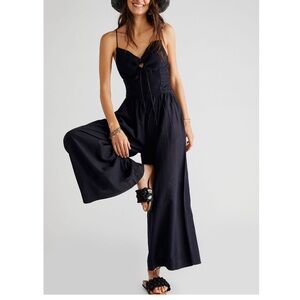 Free People Size Medium Blue Jumpsuit Endless Summer One Piece Smocked Cutouts perfect for vacation resort wear.