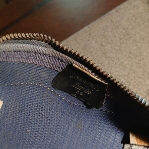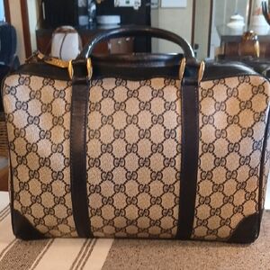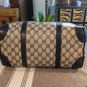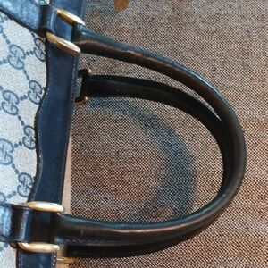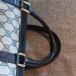 Beautiful Vintage Gucci Navy Blue Canvas Leather GG Logo Tote Hand Bag. The measurements are 13 inches wide 9.25 inches long and the depth is 6.25 inches.