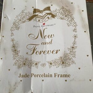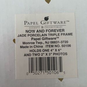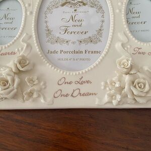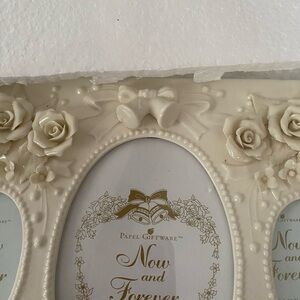 Elegant cream jade porcelain frame by . Features intricate floral designs and holds three photos. Perfect for adding a touch of sophistication to any room. Papel Giftware