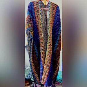 Beautiful knit kimono full or maxi length. Open with large tassels on the bottom vent split in the back.