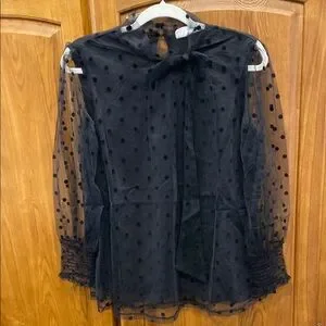 Chic black sheer blouse with polka dots. Features a bow tie and smocked cuffs. True to size. Two buttons on the back neckline. Pet/smoke free home. NWOT