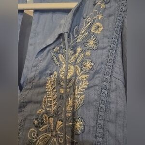 This elegant blue top features intricate embroidery, perfect for adding a touch of sophistication to your wardrobe. Ideal for any occasion.