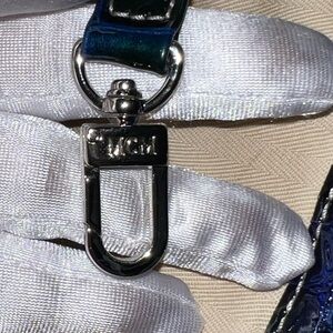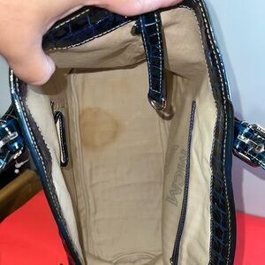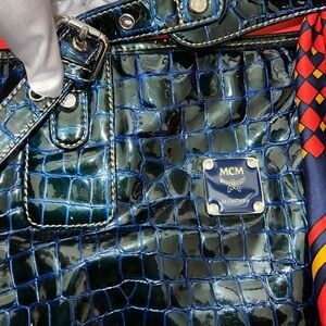 MCM patent leather bag. Dark blue color with a silver plated. Very good condition outside., but has a stain inside. No rips or tear on the leather. Please check the photos and video before u purchase. T.y🙏🏻